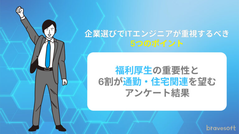 2025.9.30 トレンド・お役立ち情報 企業選びでITエンジニアが重視するべき5つのポイント〜福利厚生の重要性と6割が通勤・住宅関連を望むアンケート結果〜 ITエンジニアの需要が高まる現在、多くの企業が優秀な人材の獲得に力を入れています。採用担当者の中には、エンジニアにとって魅力的な企業とはどのような企業なのか、具体的にイメージできない方もいるかもしれま
