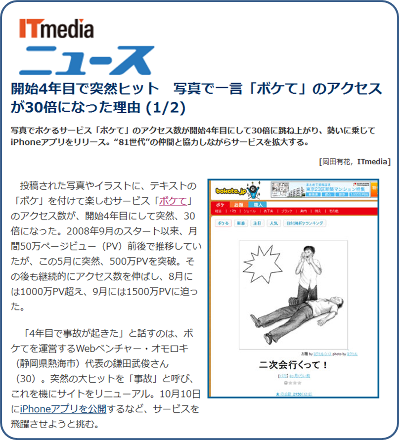 「ITmediaニュース」で、当社共同開発のiPhoneアプリ『ボケて(bokete)』が紹介され、オモロキのお二人のインタビューも掲載されています。