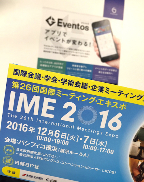 2016.12.01プレスリリース 「国際ミーティング・エキスポ 2016」 出展のお知らせ Eventos(イベントス)は来週、国際ミーティング・エキスポ 2016 へ出展します!パシフィコ横浜近くにお立ち寄りの際にはぜひお声がけください。 http://expo.nikkeibp.co.jp/ime/2016/ http://expo.nikkeibp.co.jp/ime/2016/exhibitor/company/popup.html?com_id=71
