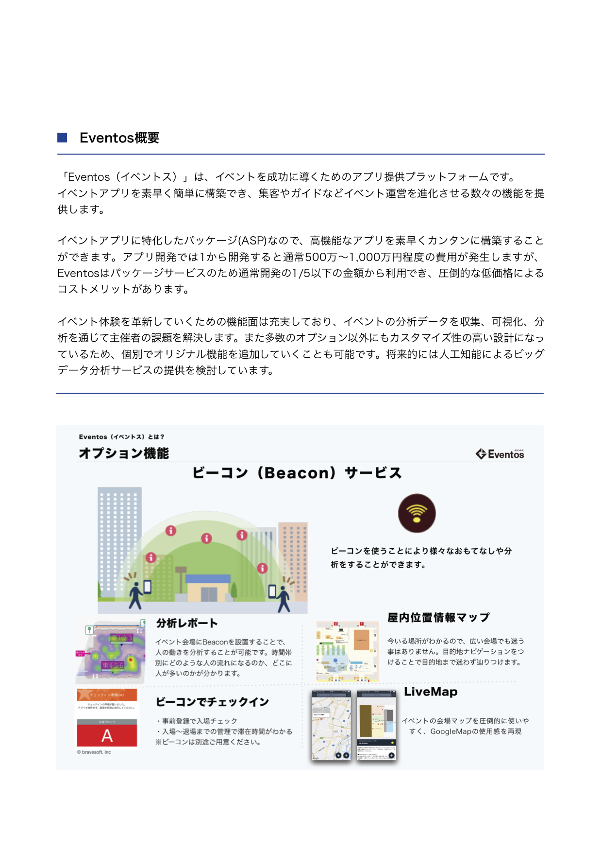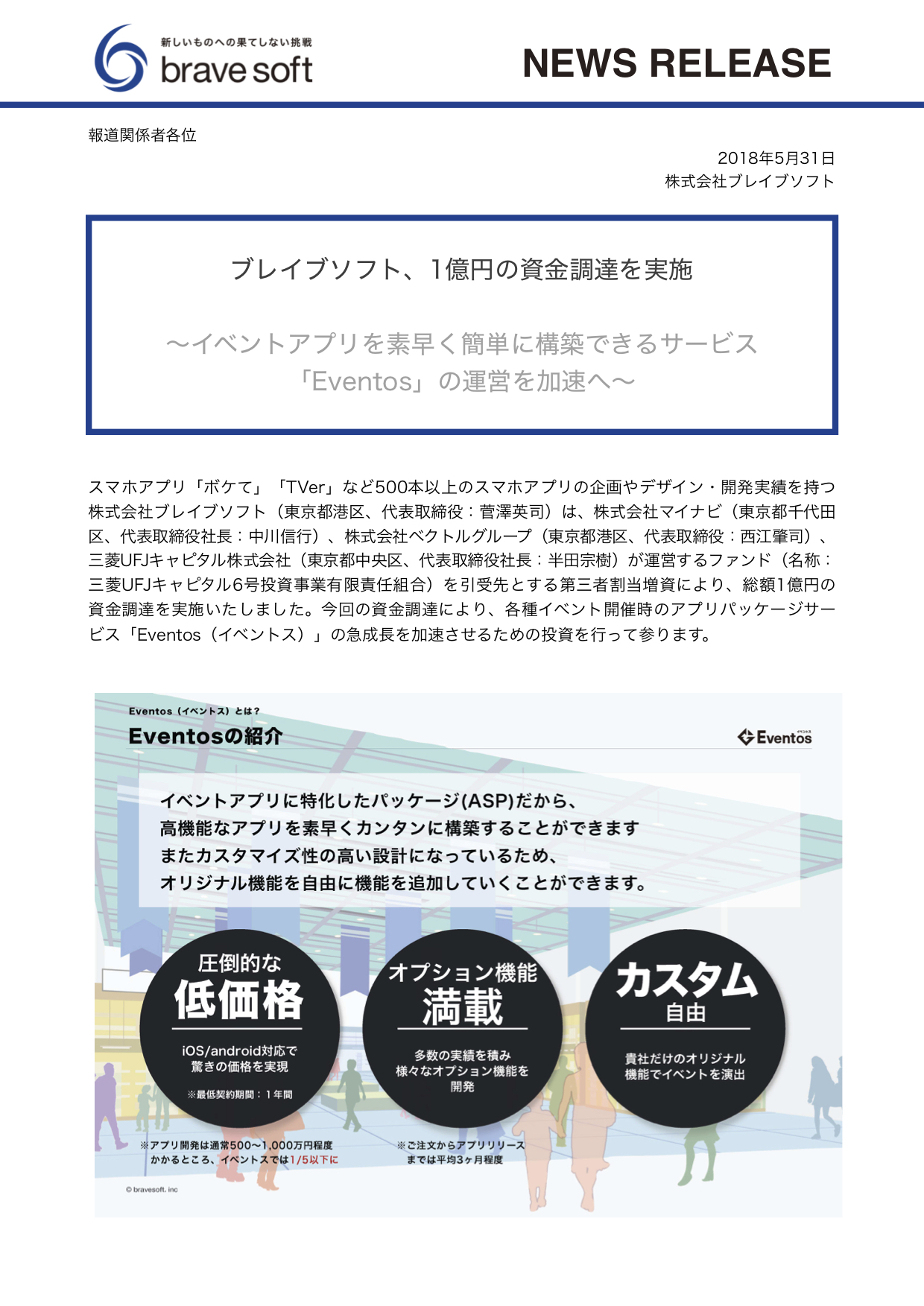 2018.05.31プレスリリース 1億円の資金調達を実施しました スマホアプリ「ボケて」「TVer」など500本以上のスマホアプリの企画やデザイン・開発実績を持つ株式会社ブレイブソフト(東京都港区、代表取締役:菅澤英司)は、総額1億円の資金調達を実施いたしました。今回の資金調達により、各種イベント開催時のアプリパッケージサービス「Eventos(イベントス)」の急成長を加速させるための投資を行って参ります。