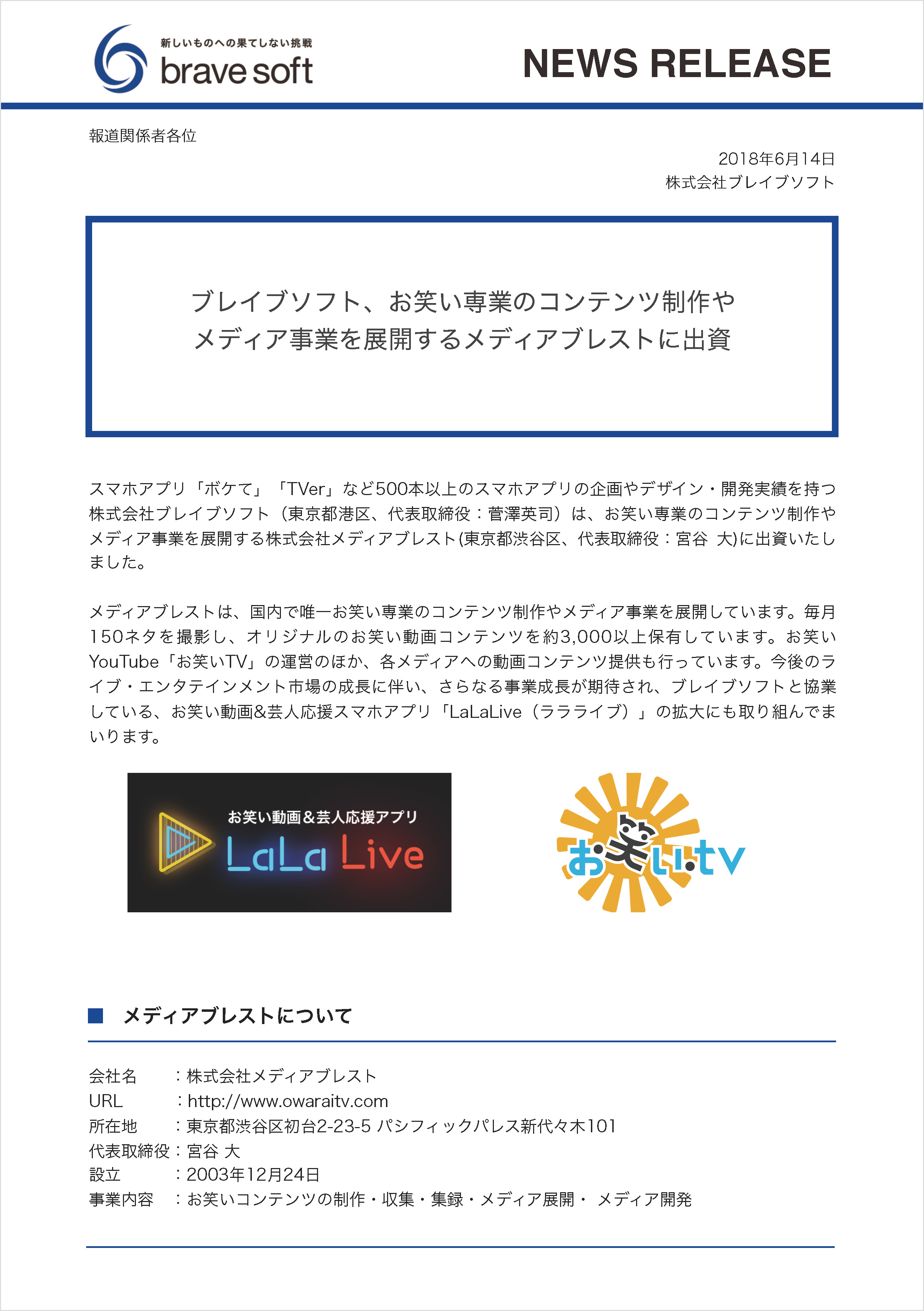 スマホアプリ「ボケて」「TVer」など500本以上のスマホアプリの企画やデザイン・開発実績を持つ株式会社ブレイブソフト(東京都港区、代表取締役:菅澤英司)は、お笑い専業のコンテンツ制作やメディア事業を展開する株式会社メディアブレスト(東京都渋谷区、代表取締役:宮谷 大)に出資いたしました。