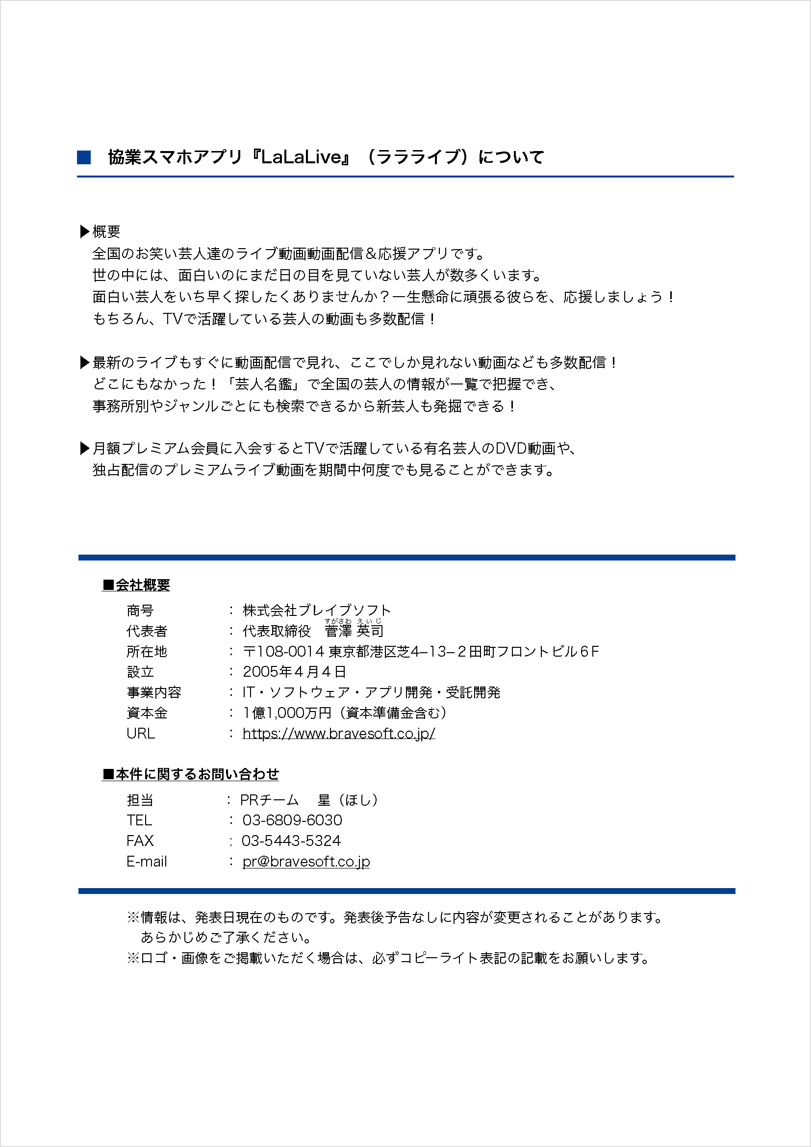 メディアブレストは、国内で唯一お笑い専業のコンテンツ制作やメディア事業を展開しています。毎月150ネタを撮影し、オリジナルのお笑い動画コンテンツを約3,000以上保有しています。お笑いYouTube「お笑いTV」の運営のほか、各メディアへの動画コンテンツ提供も行っています。今後のライブ・エンタテインメント市場の成長に伴い、さらなる事業成長が期待され、ブレイブソフトと協業している、お笑い動画&芸人応援スマホアプリ「LaLaLive(ララライブ)」の拡大にも取り組んでまいります。