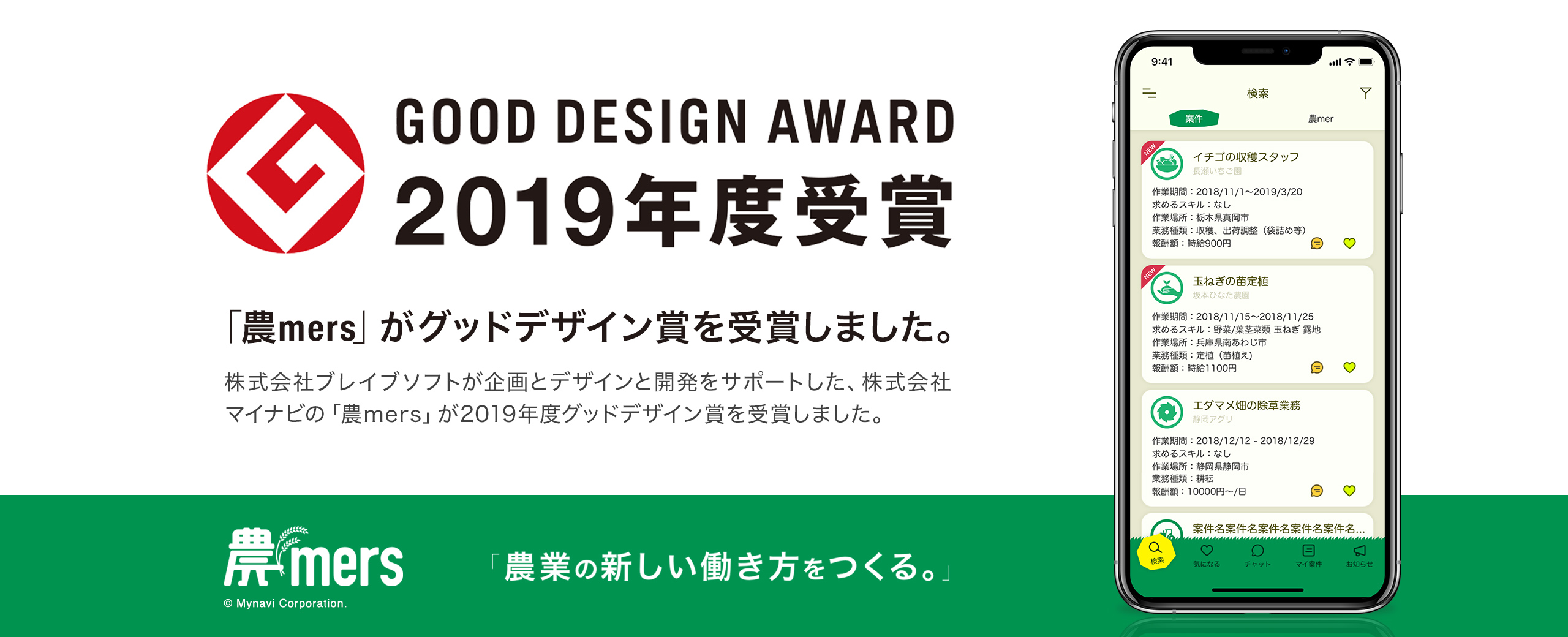 今年2019年からはメンバーも増え、更に7月からは事業部長の青木がチーフ・デザイン・オフィサー(CDO)にも就任し、これまでの「ブレイブソフト=アプリ開発会社」という世間的なイメージを、「ブレイブソフト=アプリ企画会社」「ブレイブソフト=アプリデザイン会社」と思って頂けるよう、企画・デザインでもっと実績を出していきたいと考えておりましたので、今回このような形でグッドデザイン賞を受賞する事ができた事を嬉しく思います。