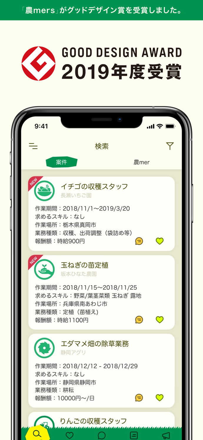 人手が必要な農家と新規就農者や離農者のマッチングを手軽なアプリで実現するサービス。