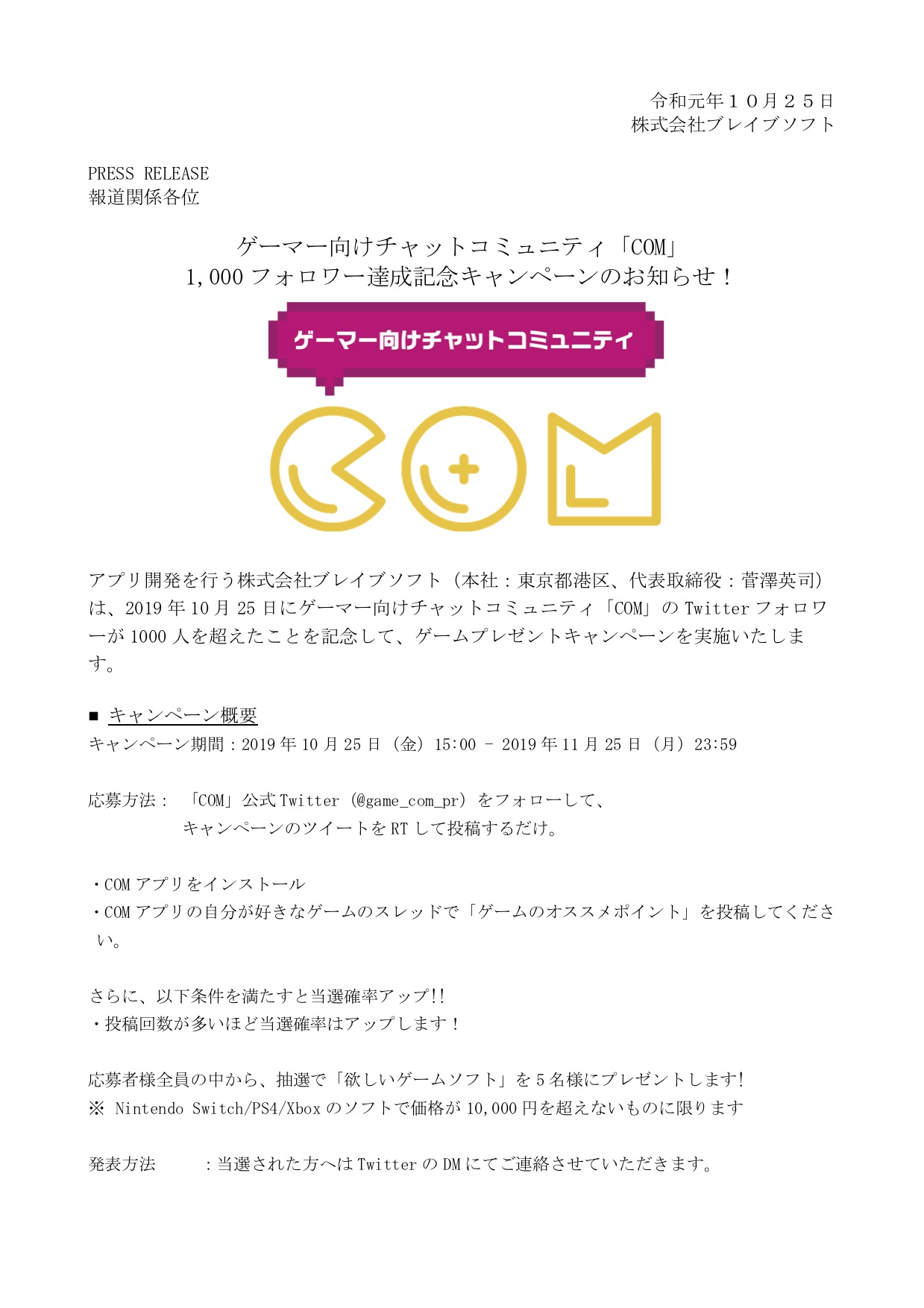 ゲーマー向けチャットコミュニティ「COM」 1,000 フォロワー達成記念キャンペーンのお知らせ