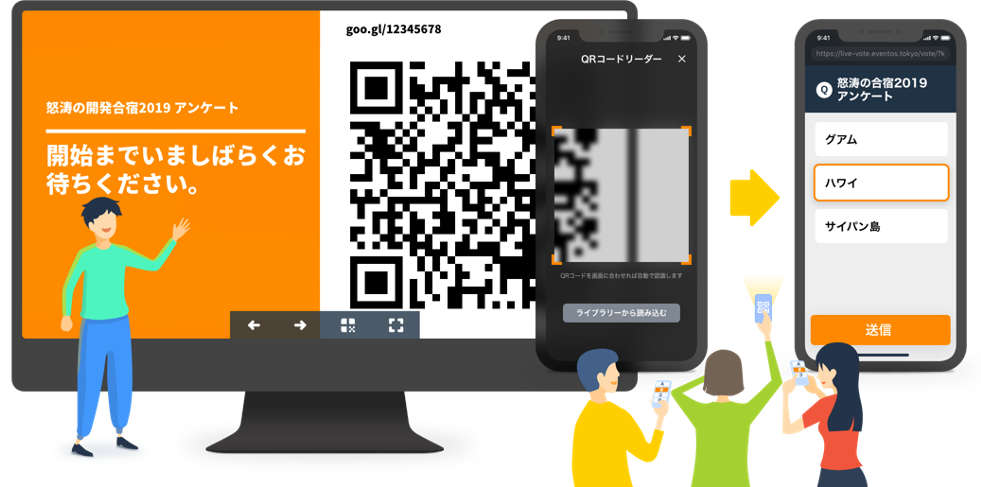 さらに、Live!アンケート(https://enquete.eventos.tokyo/)を活用すれば、自宅にいながらにして「みんなで投票」「リモート質疑応答」など、インタラクティブ性のあるオンラインイベントが開催できます。インタラクティブなイベントで盛り上がるためにも配信遅延の少ない有料配信サービスをご検討ください。