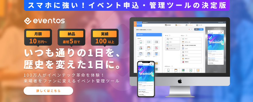 600万以上のDL数を誇る「bokete(ボケて)」や、「TVer」など、800件以上のアプリ開発の実績と月額10万円でイベントの申込管理やライブ配信、公式アプリ構築など一元管理を支援するプラットフォーム「eventos」を展開するbravesoft株式会社(本社:東京都港区、代表取締役:菅澤英司)は、自社イベントサイトの構築とオンライン開催やライブ配信を可能にする「eventos Live!配信」を、新型コロナウイルス対策でのイベント中止を回避するため、本日3月27日より「特別キャンペーン価格」で提供致します。