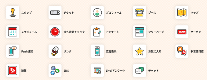 「チケット・来場申込」「情報収集」「マッチング」など、イベント前に使える機能から、「スケジュール」「ガイドマップ」「待ち時間」のような、イベント当日のストレスを軽減する機能、「スタンプラリー」「リアルタイムアンケート」など、イベントを盛り上げる機能、イベント後の「アンケート」「分析」など、次回のイベントをより良くするための機能を備えています。また、昨今話題のライブ配信でオンラインイベントを開催することも可能です。
