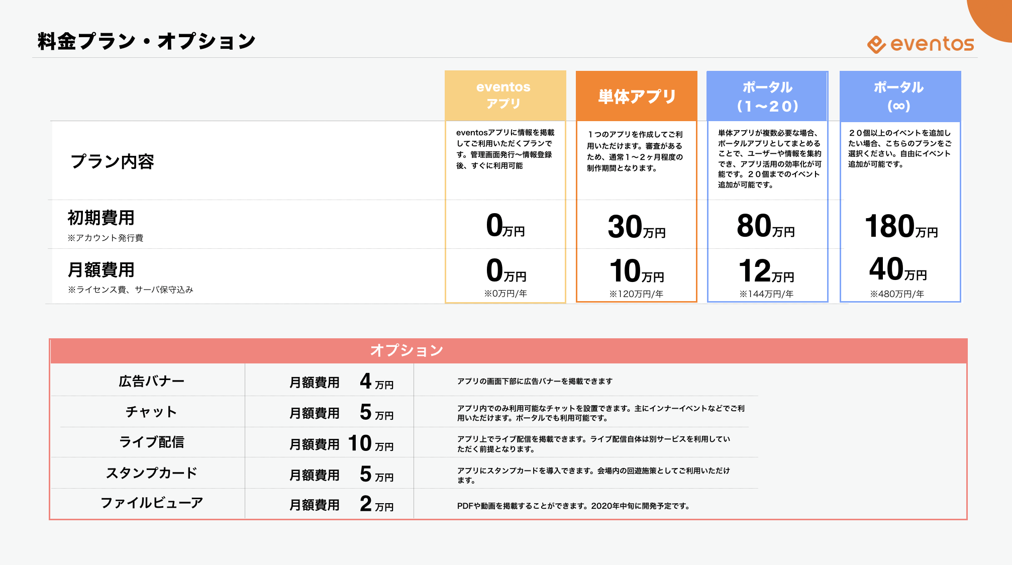 ・新型コロナウイルスの感染拡大が収束するまでの期間(3月末まで)、「eventos アプリサービス」(初期費用14万円、月額費用3万円)を無料でご提供しておりましたが、今後3月以降は期限を設けずに無料でご提供を開始させていただきます。