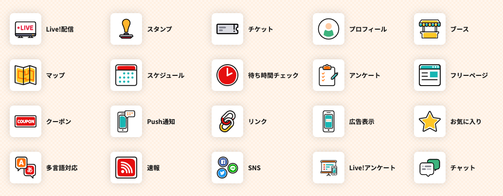 イベント前の「チケット申し込み」「情報収集」などの当日に備えた機能、イベント当日の「フロアガイド」「待ち時間ガイド」などのストレスを軽減する機能、「スタンプカード機能」「リアルタイムアンケート」などのイベント中に盛り上がれる機能、イベント後の「アンケート実施」「分析」など次回以降のイベント開催に向けた施策を考えられる機能も搭載しております。さらに、eventosを利用してライブ動画配信を実現することも可能です。