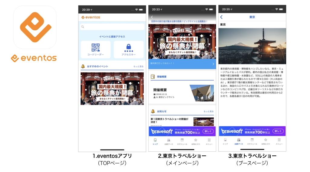 登録したイベントが、上記1 eventosアプリTOPページに一覧で表示され、 管理画面でアプリ情報を登録すると、上記2 東京トラベルショーメインぺージ・上記3 東京トラベルショー ブースページのような見た目で表示され、「バナー」「お知らせ」「ブース情報」「スケジュール」などのイベントにおいて必要な機能を設定・登録する事が可能となります。