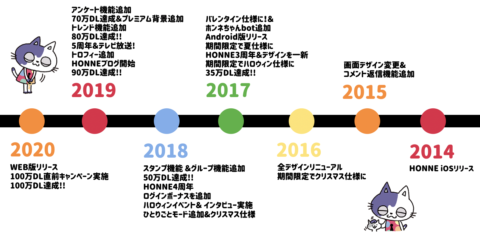 HONNEは2014年8月発売以来、ユーザーの皆様のご意見を頂きながら、様々な機能改修やアップデートを行ってきました。そんなHONNEの100万ダウンロードまでの年表をご紹介します。