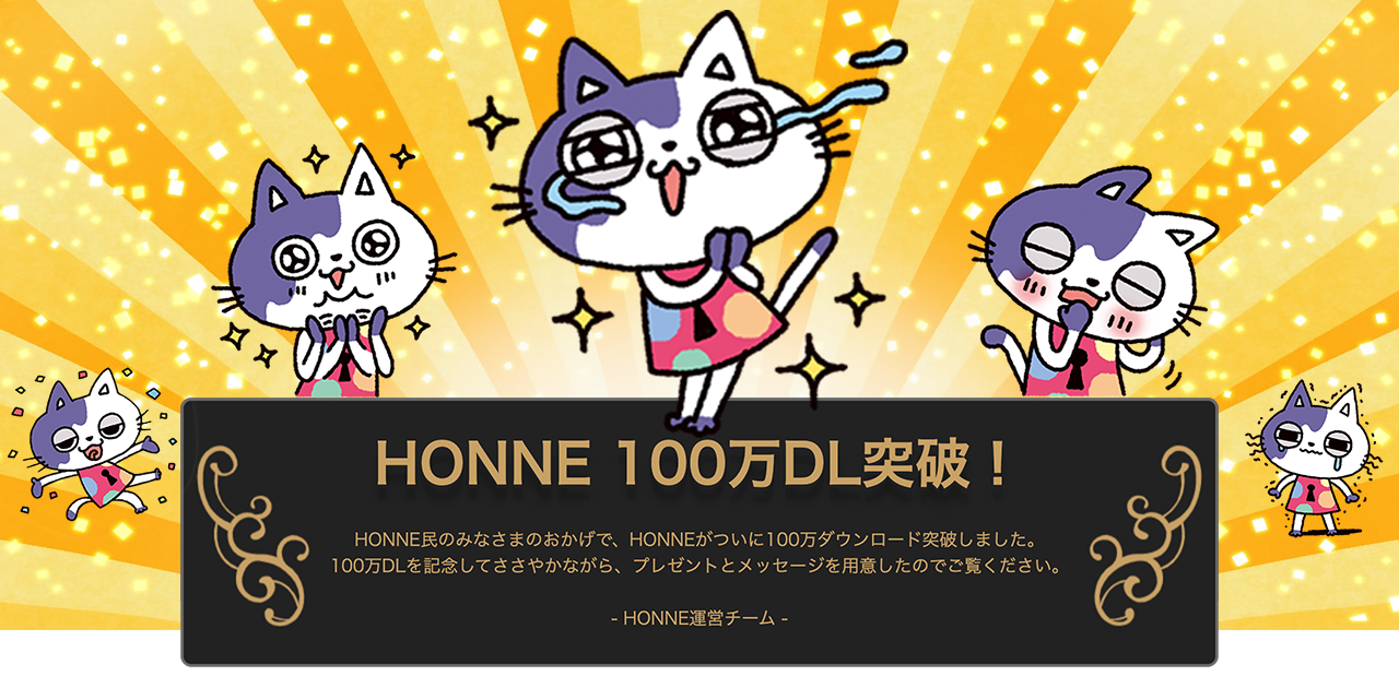 「HONNE」がついに100万ダウンロードを突破したことを記念として、ささやかながらユーザーの皆様にプレゼントとメッセージを用意しました。