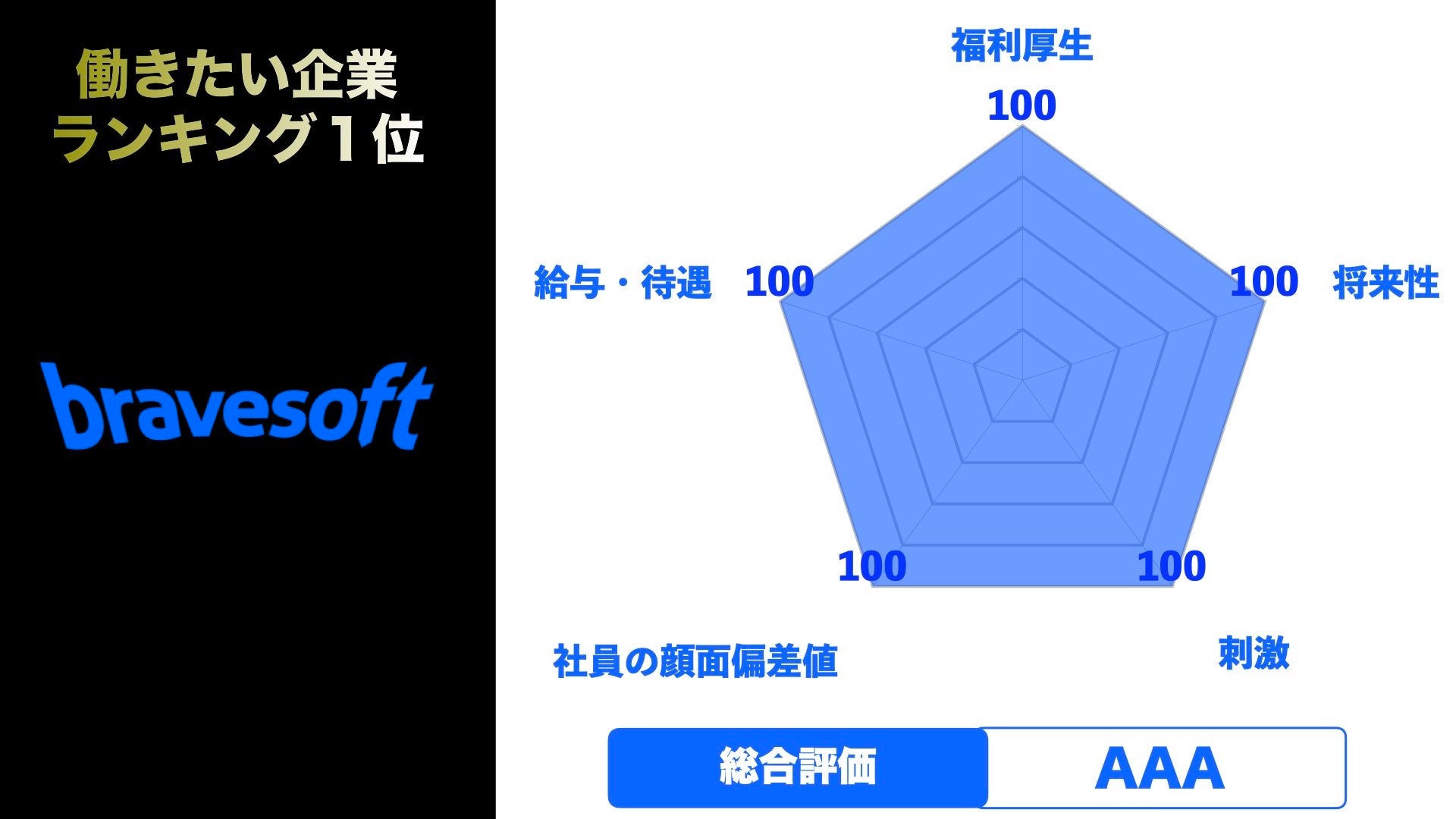 今回の評価基準であった「福利厚生」「給与・待遇」「将来性」「社員の顔面偏差値」「刺激」の5項目におきまして、全て100点満点を獲得し、総合評価もAAAをいただき、非常に嬉しい結果となりました。