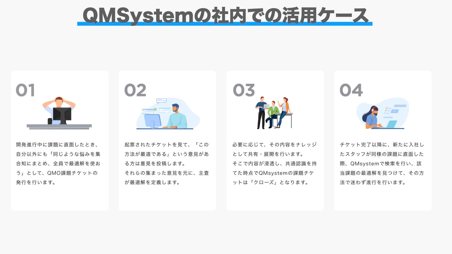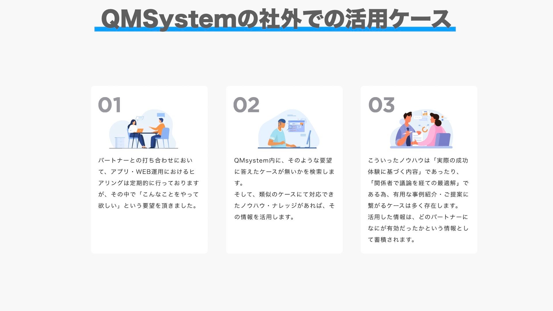 このような蓄積すべきノウハウ・ナレッジを一元管理し、部門ごとで培ったノウハウの共通展開を行うべく、2021年初頭よりアセット整理、同年4月よりQMsystemとして構築を始め、2021年8月より全社へ順次展開して品質水準の向上、品質評価の定量化を行い、「お客様からの信頼獲得」「パートナーさま事業へのグロース支援」「メンバー成長の促進」、特に社歴の若い新卒・中途採用者の「早期オンボーディング」を実現しております。