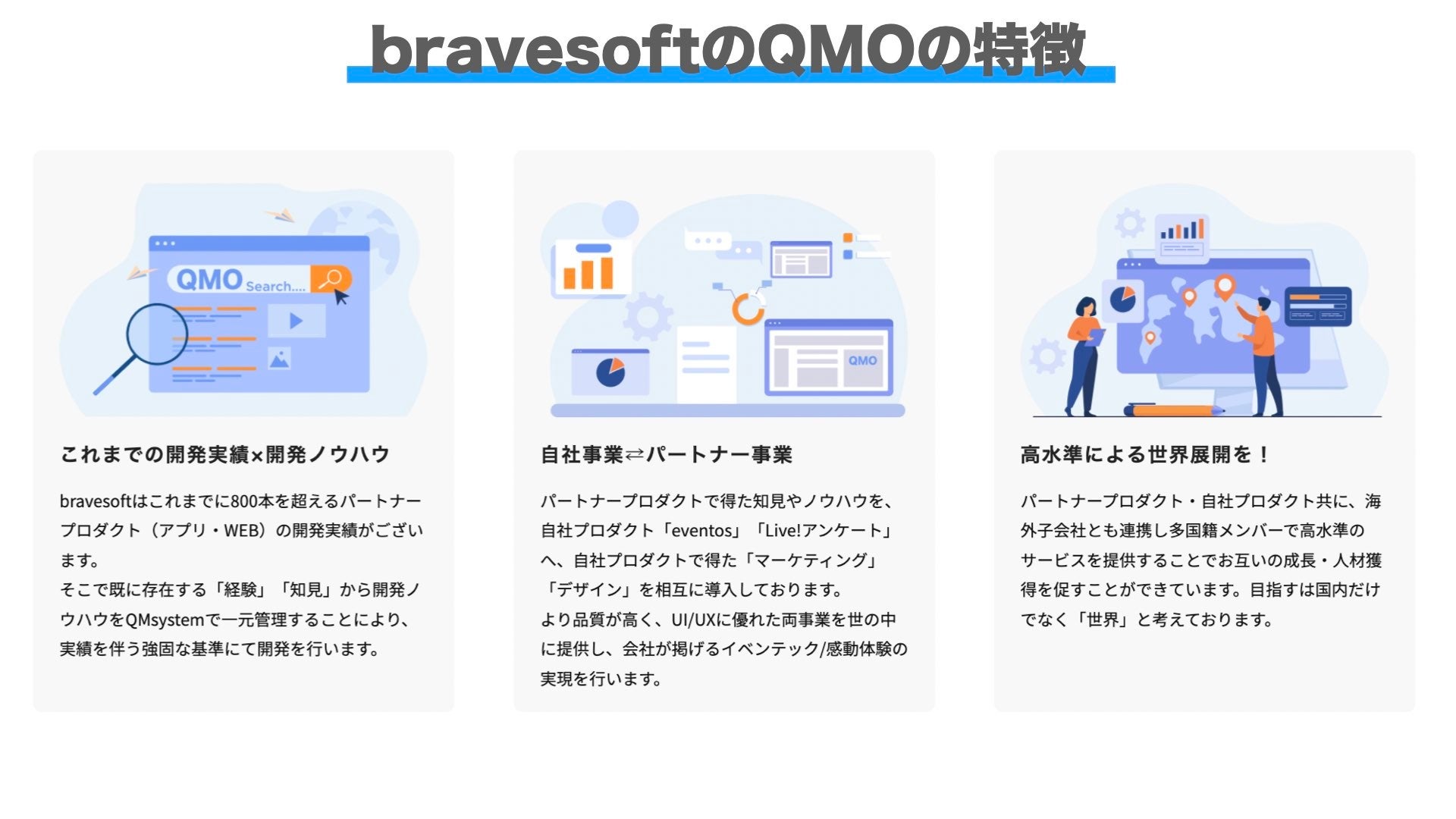 bravesoftのQMOの強みとしては、これまで800本を超えるアプリ・WEB開発による豊富なナレッジを所有している「量」の部分、パートナー事業だけではなく自社事業も行なっており、企画から開発後の運用まで一気通貫で経験している「質」の部分、海外子会社との連携や世界進出などの多角的な展開を目指している「ビジョン」が強みであると考えております。