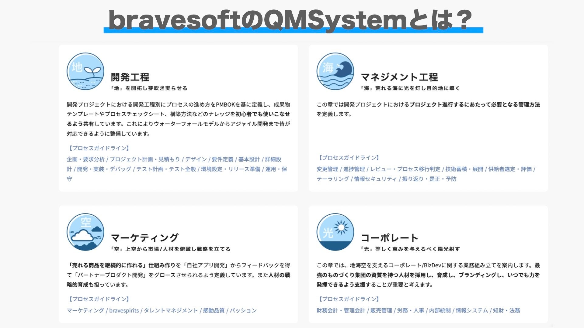 「このQMOという仕組み自体が“王道”であると私は考えています。それは勇者の行動をbrave spiritsとして標榜するbravesoftだからこそ成し得ること。そしてこの価値観を反映したQMsystemが広く使われ、日本から世界に発信され、世界から勇者が集うだろう。そしてソフトウェアエンジニア発の新しい事業が次々と新時代を築いていく。業界全体に向けて、こういう取り組みは当たり前であるという未来をつくっていくことが、今自分が一番実現したいことですね」