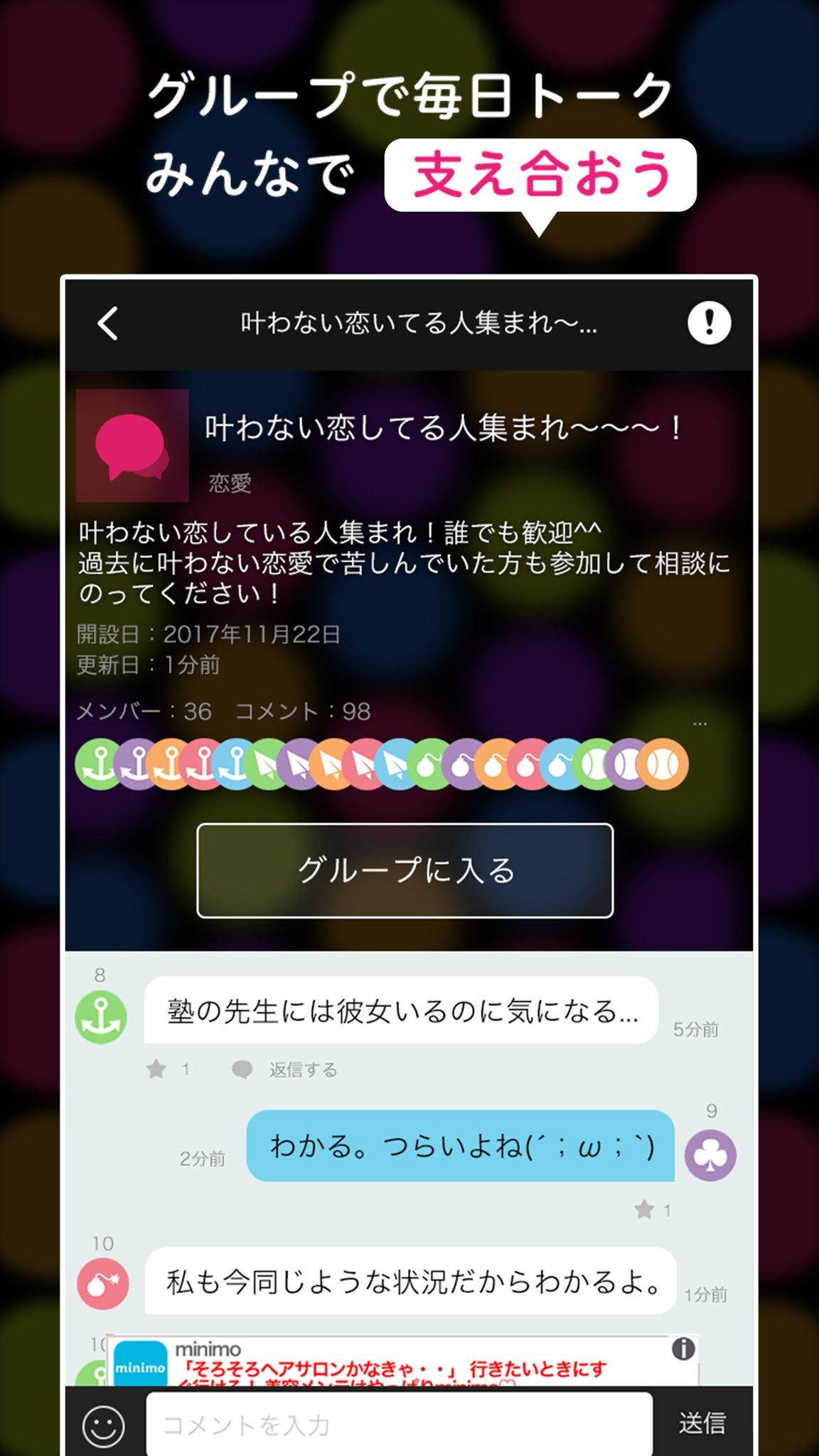 個人は自由にグループを作成でき、グループ内でトークできる機能です。全員が匿名のグループで日々支え合える関係を築けるよう自分でオリジナルの項目を作成しメンバーを集めて会話できる場所を作りました